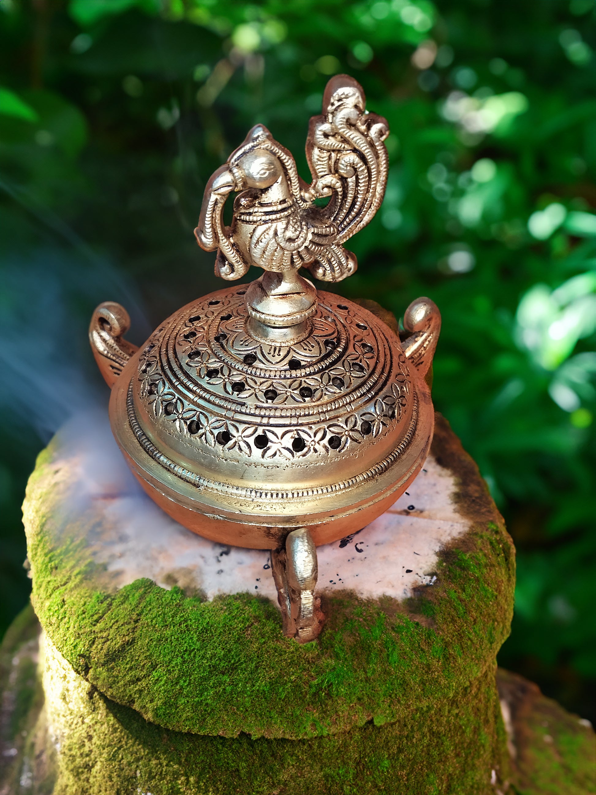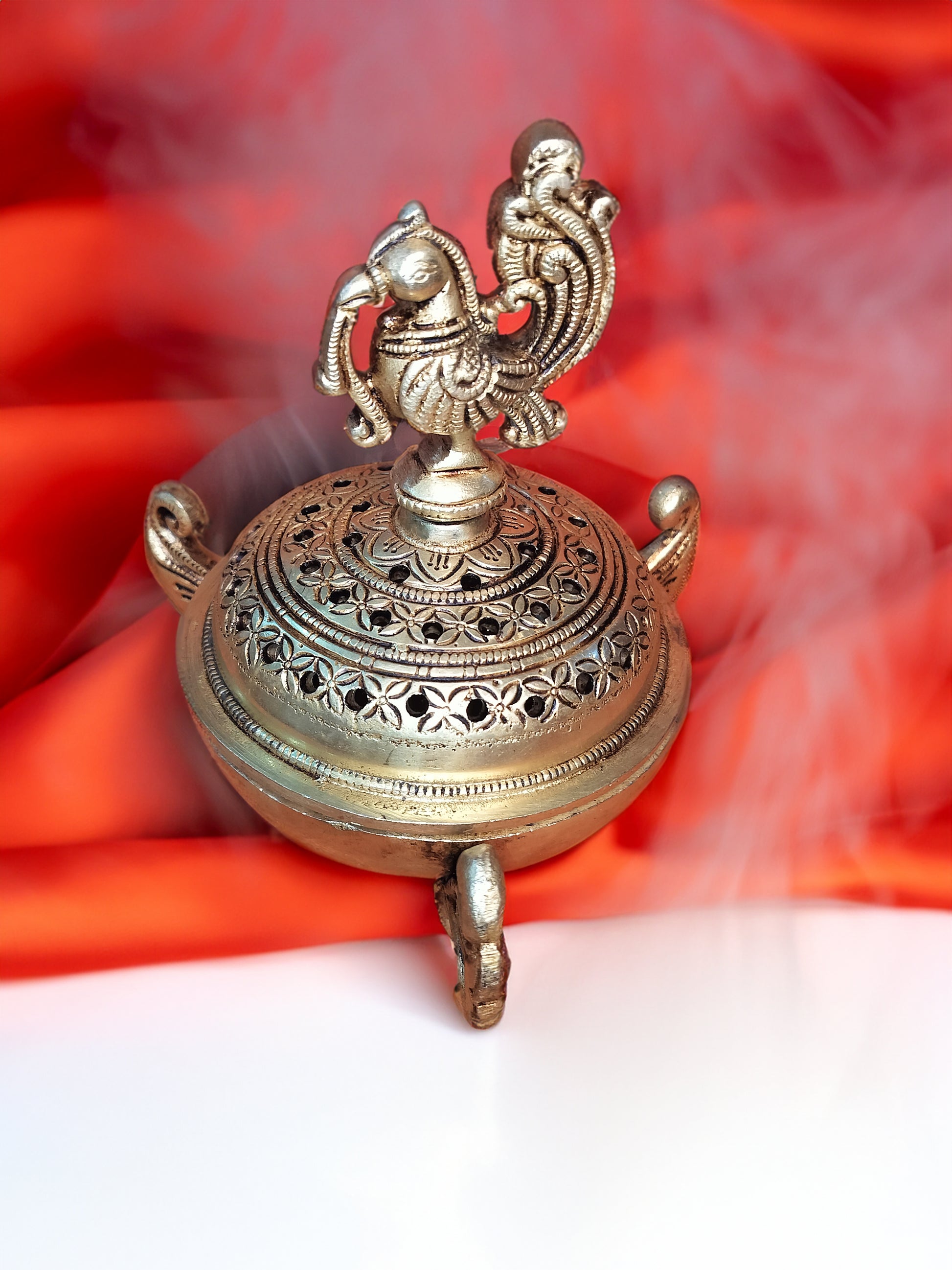 - Peacocking with Pride: Topped with a majestic peacock, this handcrafted brass dhoopdani adds a touch of elegance and cultural flair to your space.