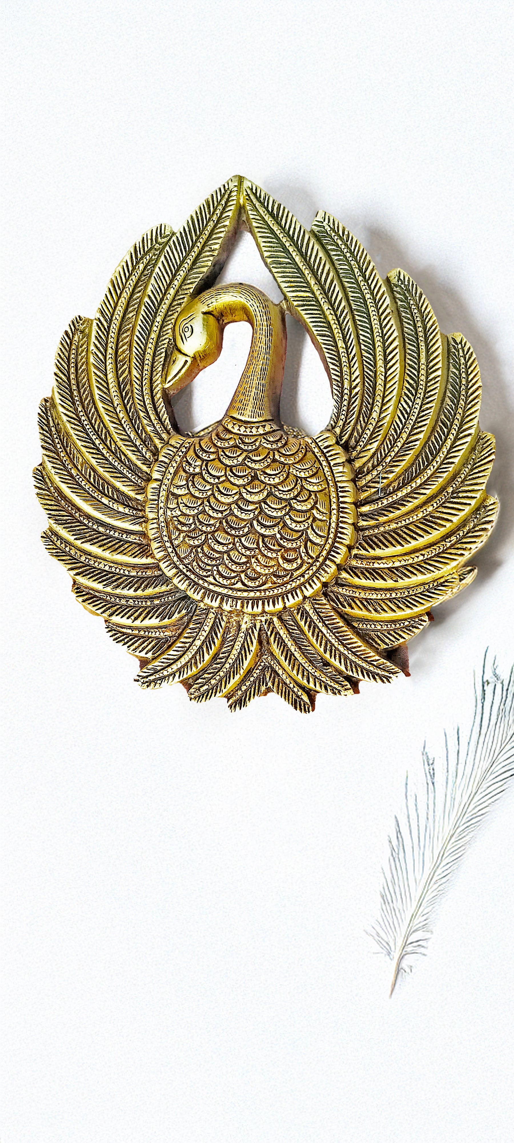 Capture the serene beauty of nature with this brass peacock wall hanging. The intricate detailing of the peacock's open feathers showcases the artisan's skill, creating a piece that's both refined and captivating. Handcrafted in Aligarh, this wall hanging adds a touch of understated glamour to your home.