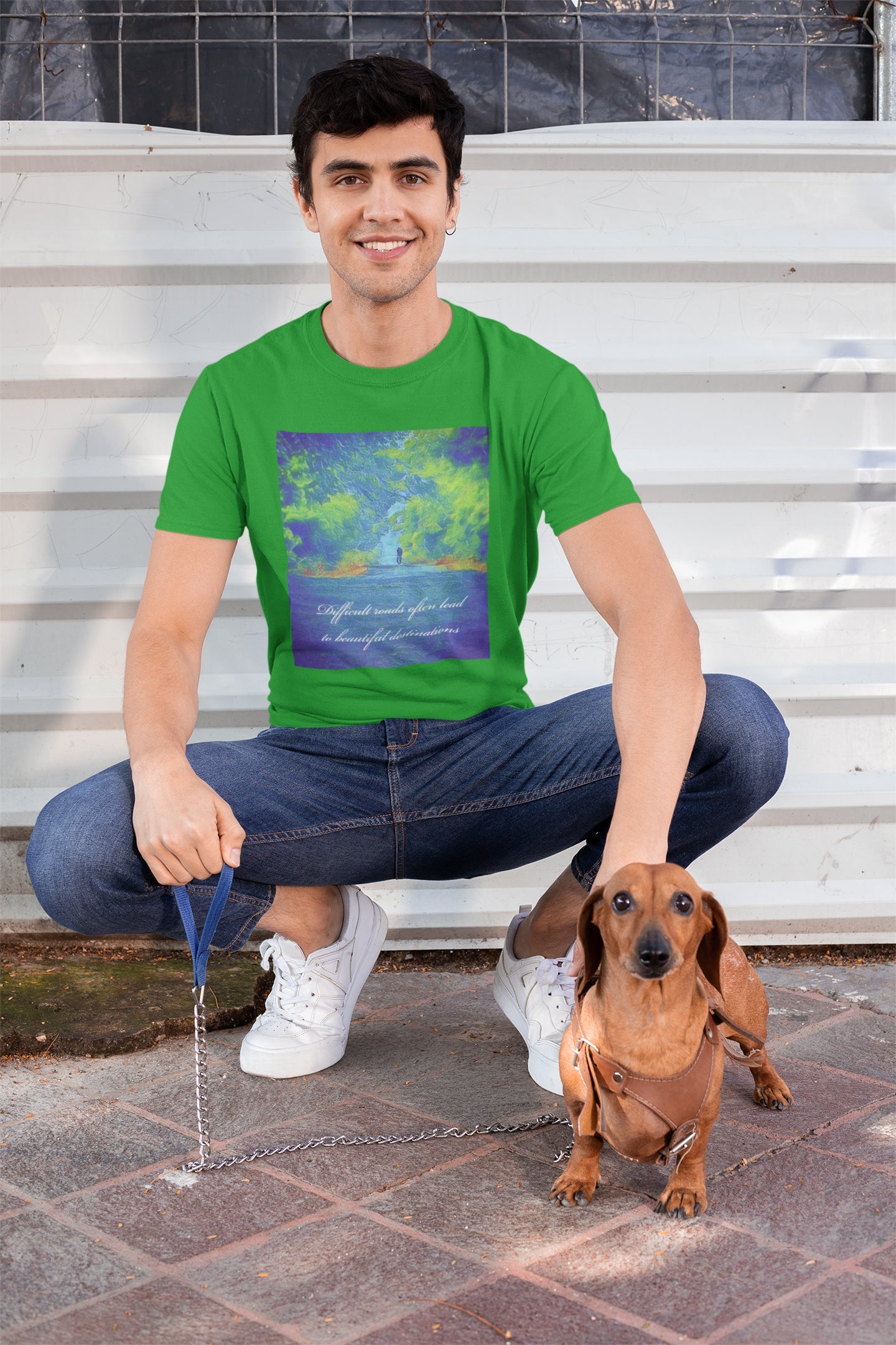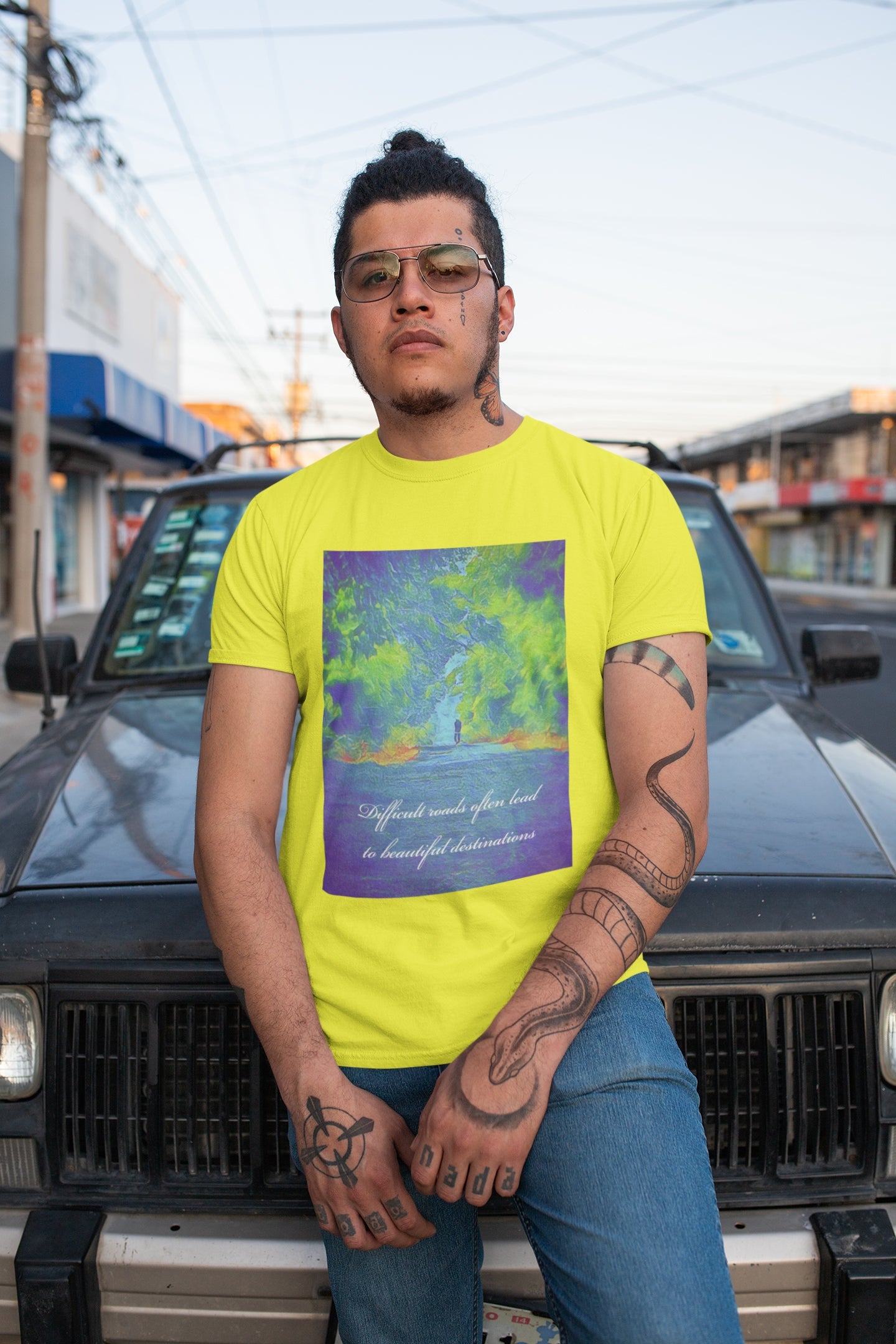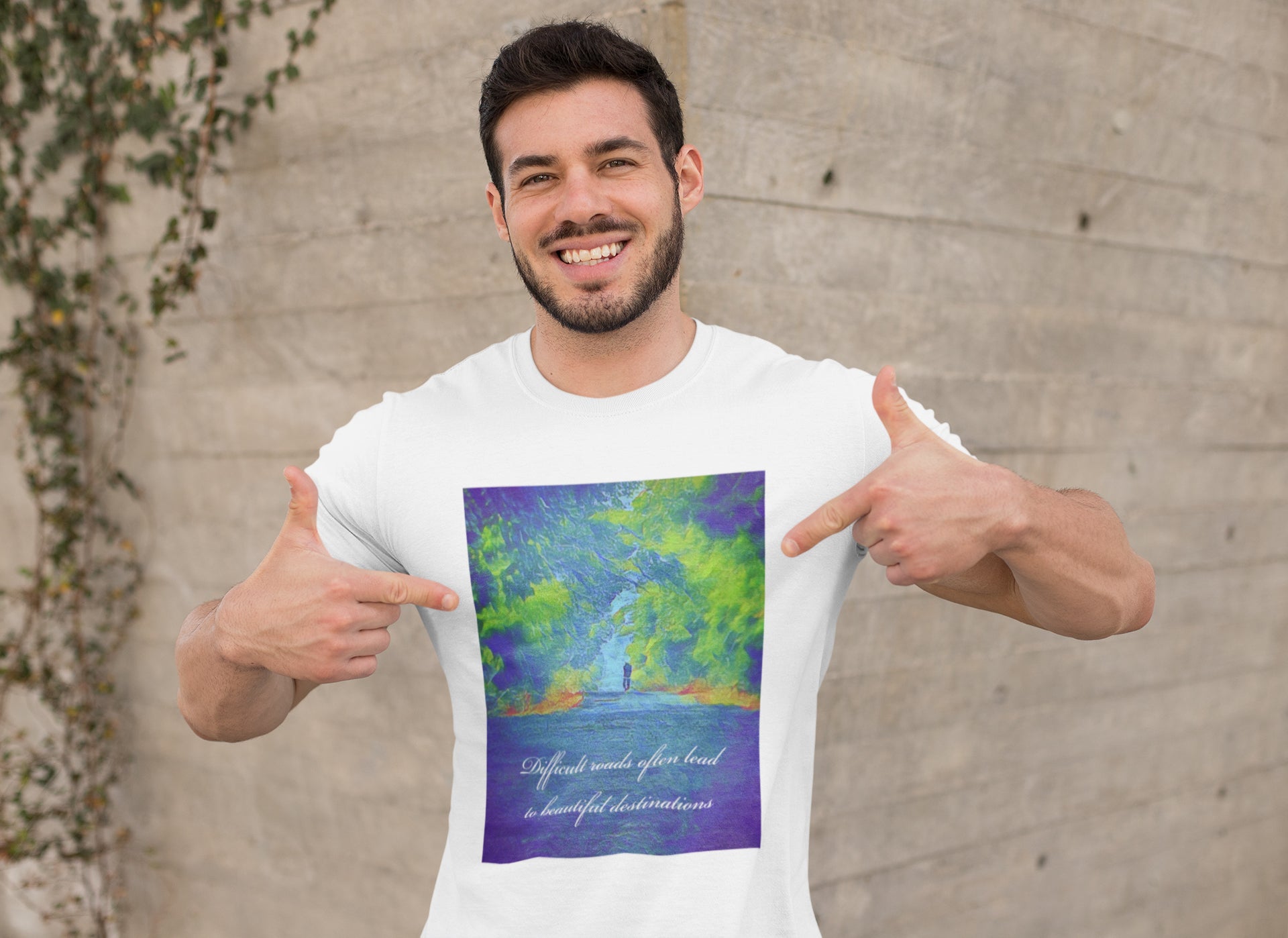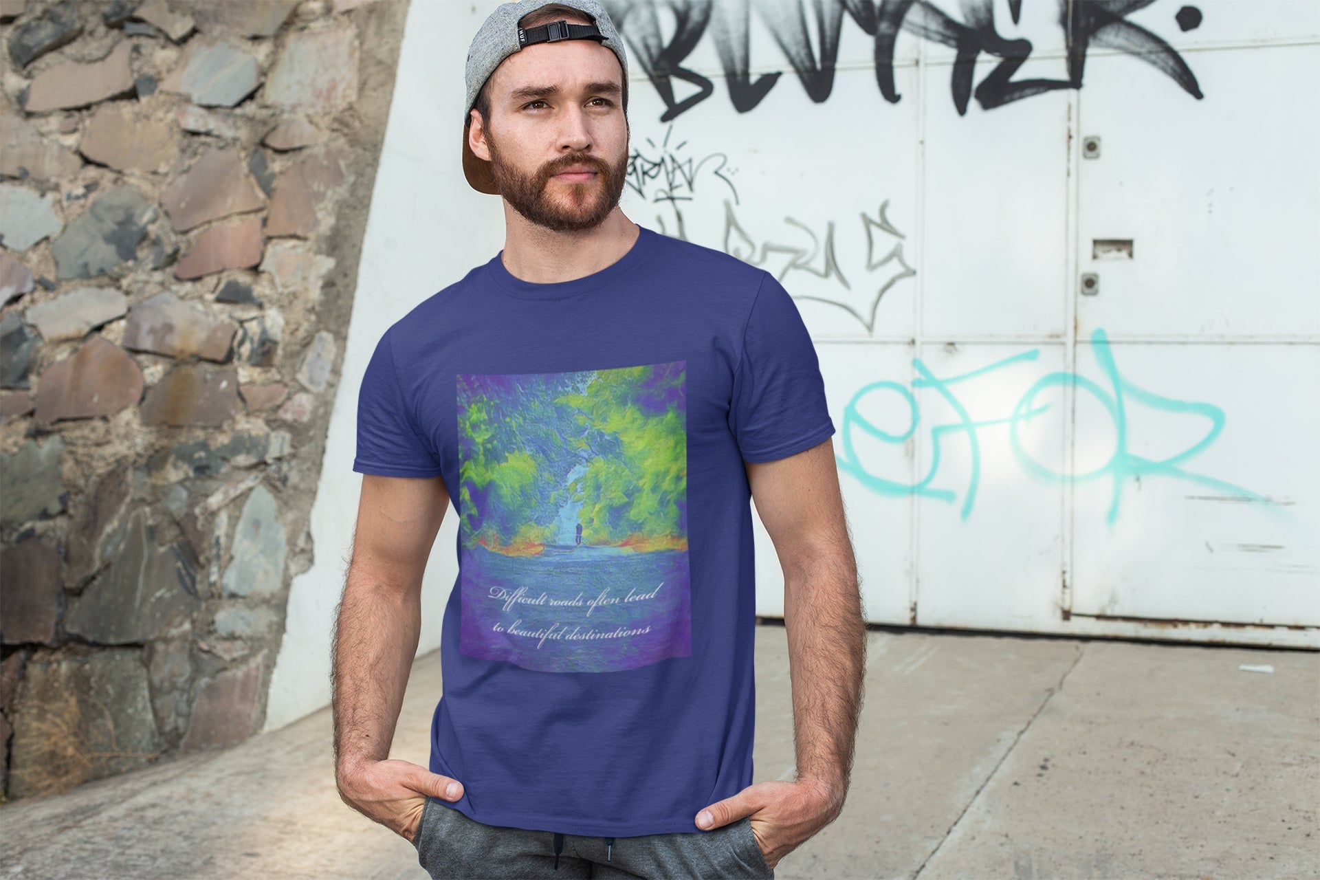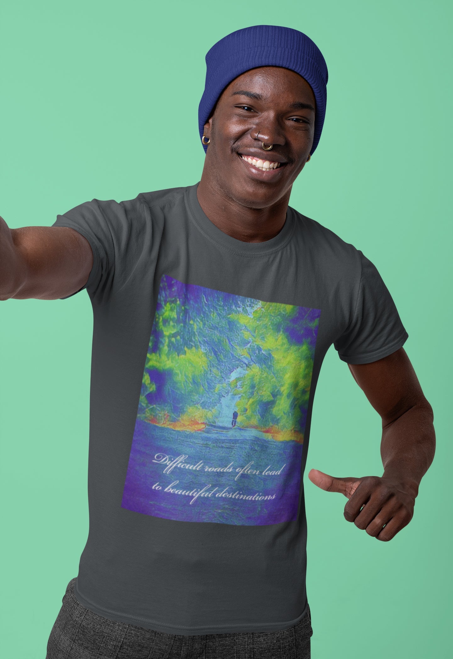 Warum also warten? Nehmen Sie die Herausforderungen des Lebens an und inspirieren Sie andere, dasselbe zu tun, mit diesem Baumwoll-T-Shirt für Männer mit der Aufschrift „Difficult Roads Lead to Beautiful Destinations“. Bestellen Sie noch heute und beginnen Sie Ihre Reise zu Ihrem eigenen schönen Ziel.