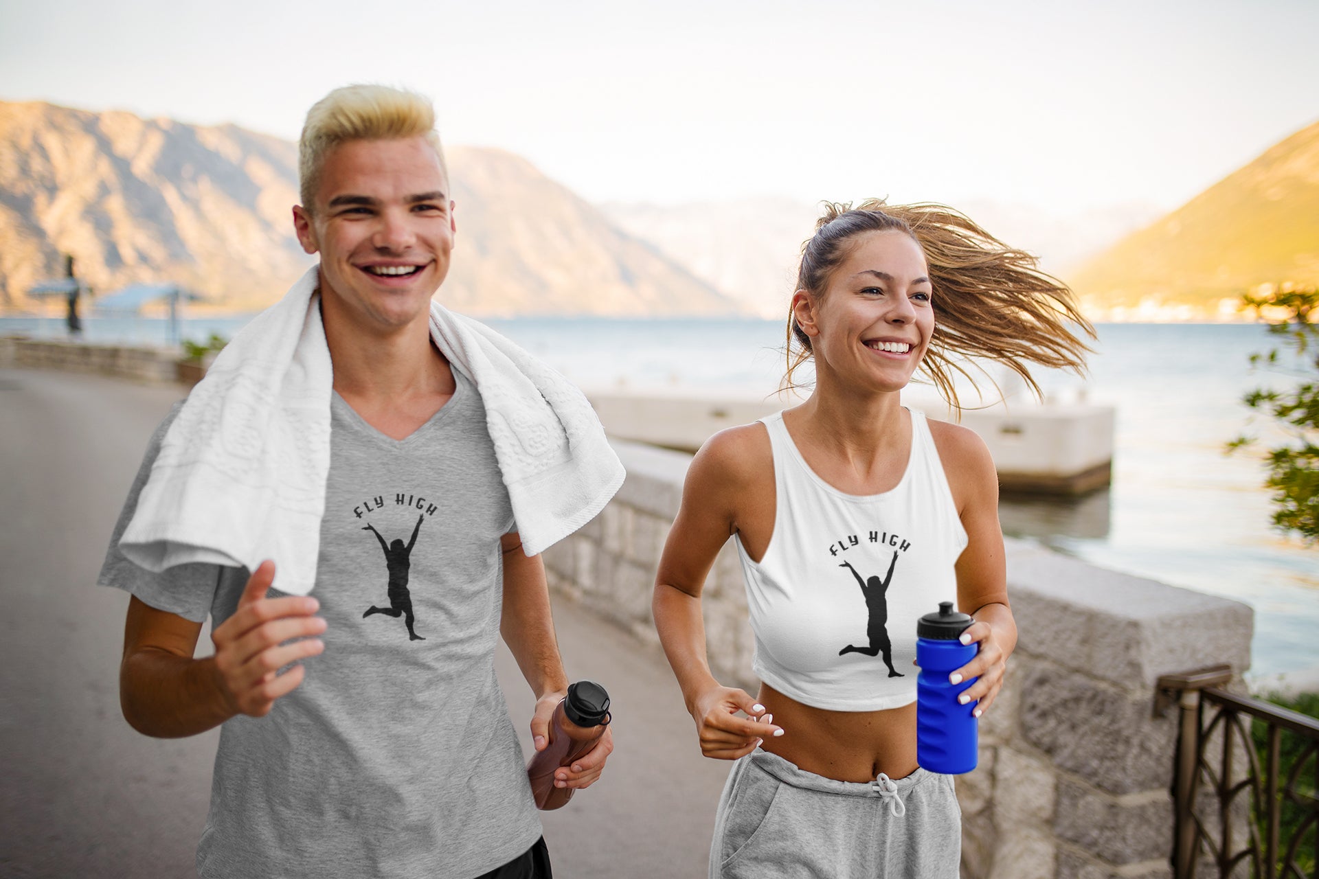 Der Aufdruck mit einem Mann, der versucht, wie ein Vogel zu fliegen, mit Fly High-Text in einem Bogen ist ein schickes Design, das Sie zu Hause, im Büro, beim Einkaufen oder auf Reisen tragen können.