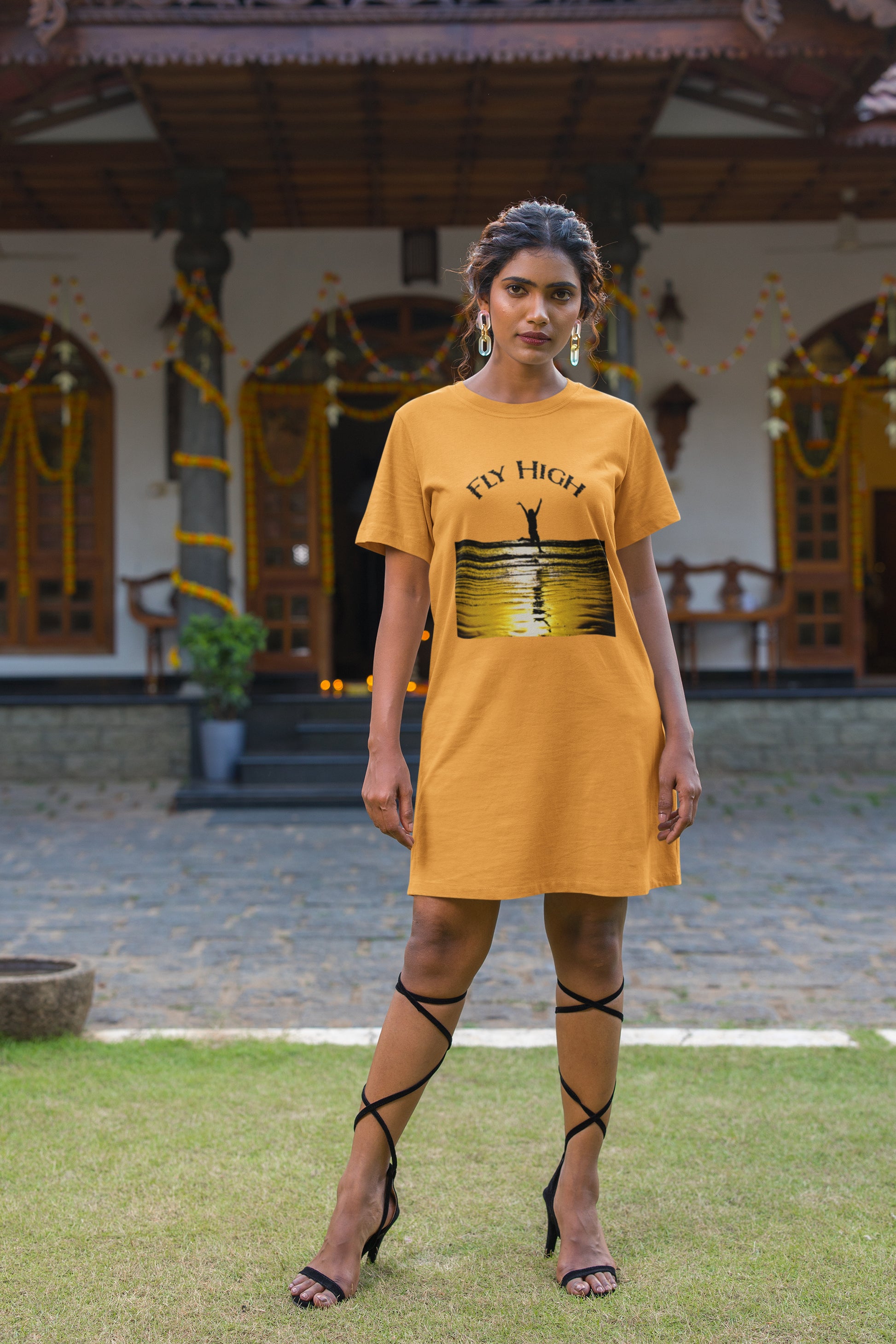 Der Aufdruck mit einem Mann, der versucht, wie ein Vogel zu fliegen, mit Fly High-Text in einem Bogen ist ein schickes Design, das Sie zu Hause, im Büro, beim Einkaufen oder auf Reisen tragen können.