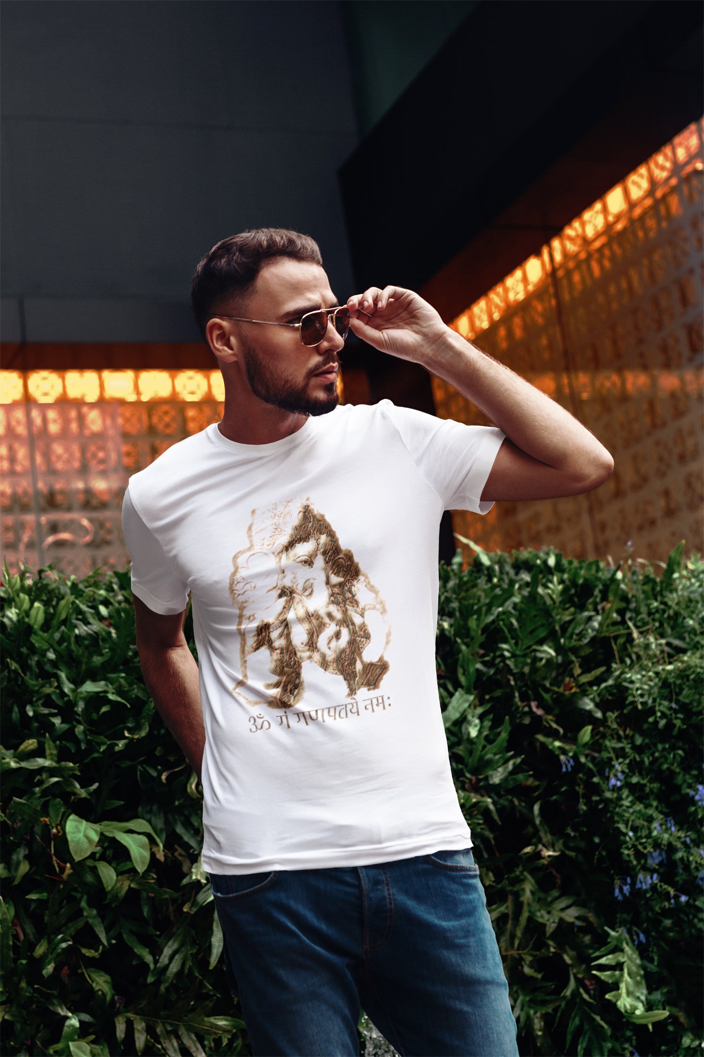 Heben Sie Ihren Stil und Ihre Spiritualität mit unserem weißen Herren-T-Shirt hervor, das mit dem göttlichen Bild von Lord Ganesha und dem heiligen Mantra „Om Gan Ganapataye Namah“ verziert ist. Erleben Sie mühelos die Verschmelzung von Mode und Glauben und laden Sie die Weisheit und den Segen von Lord Ganesha in Ihre tägliche Reise ein.