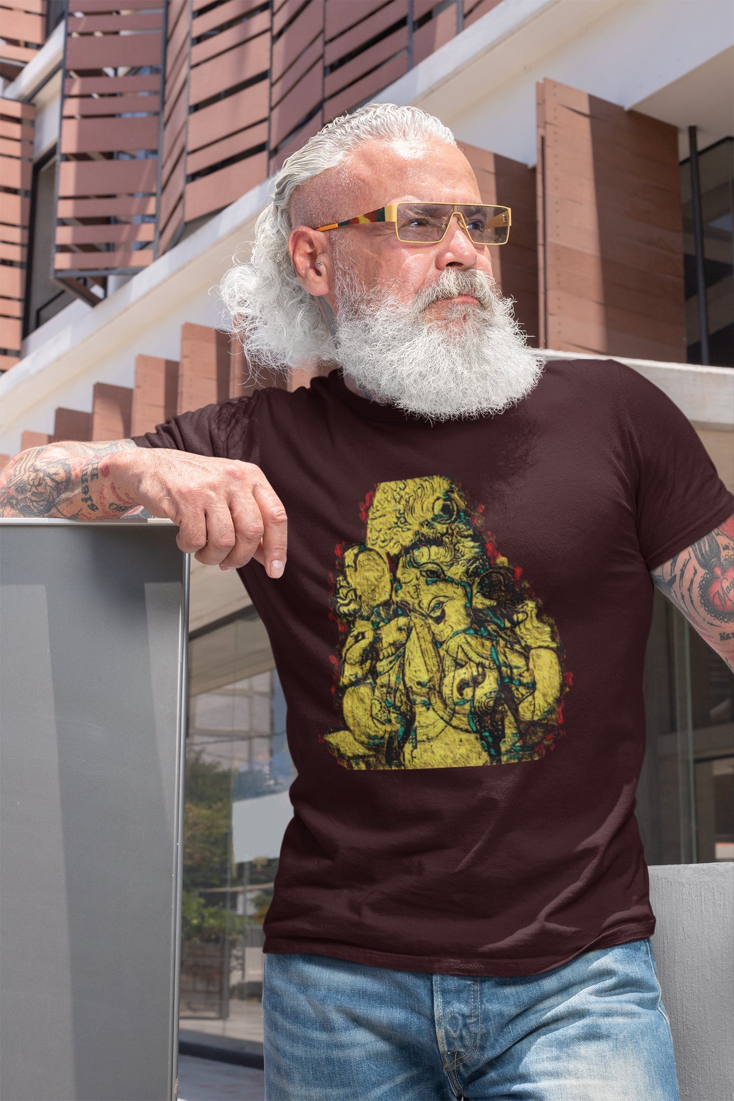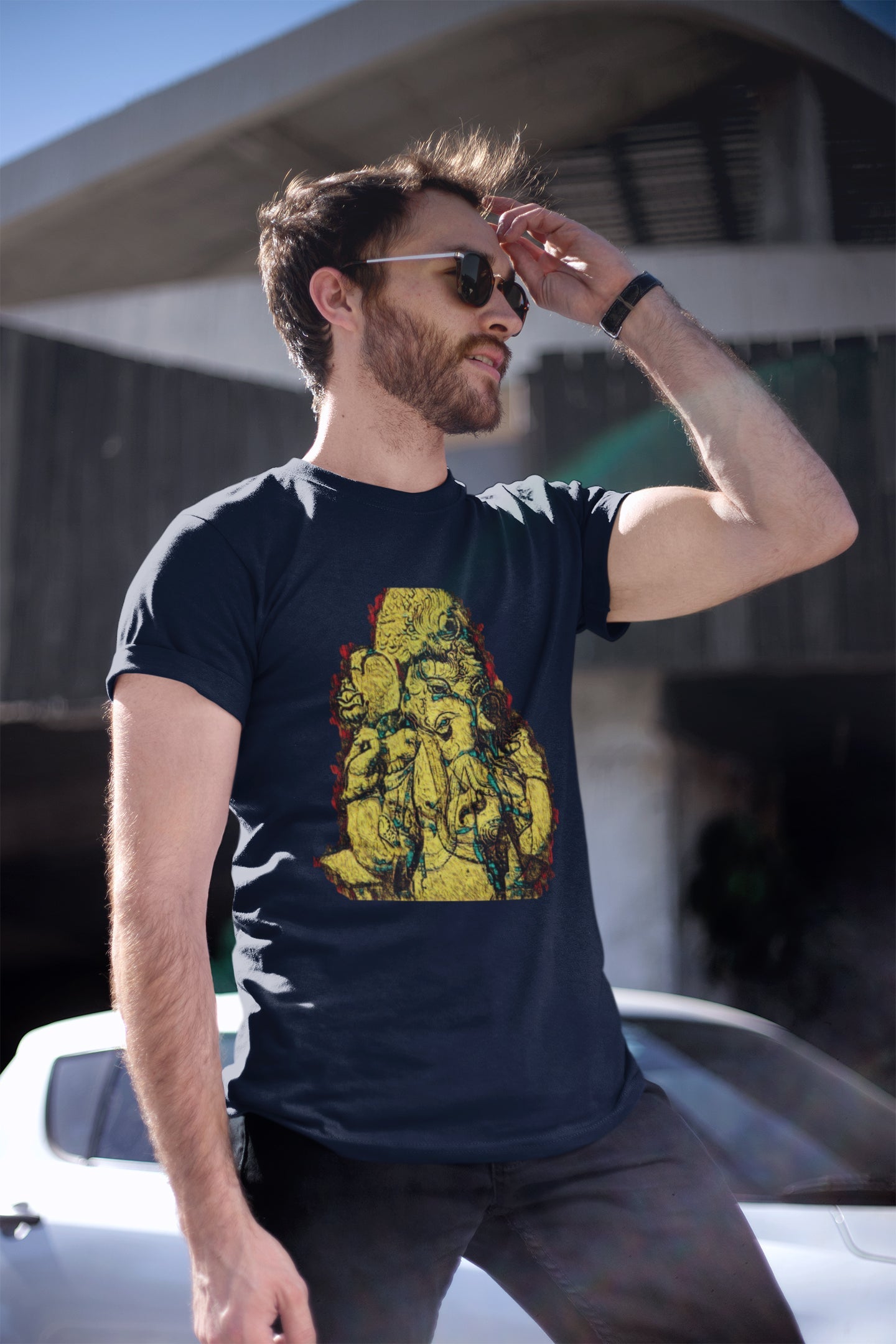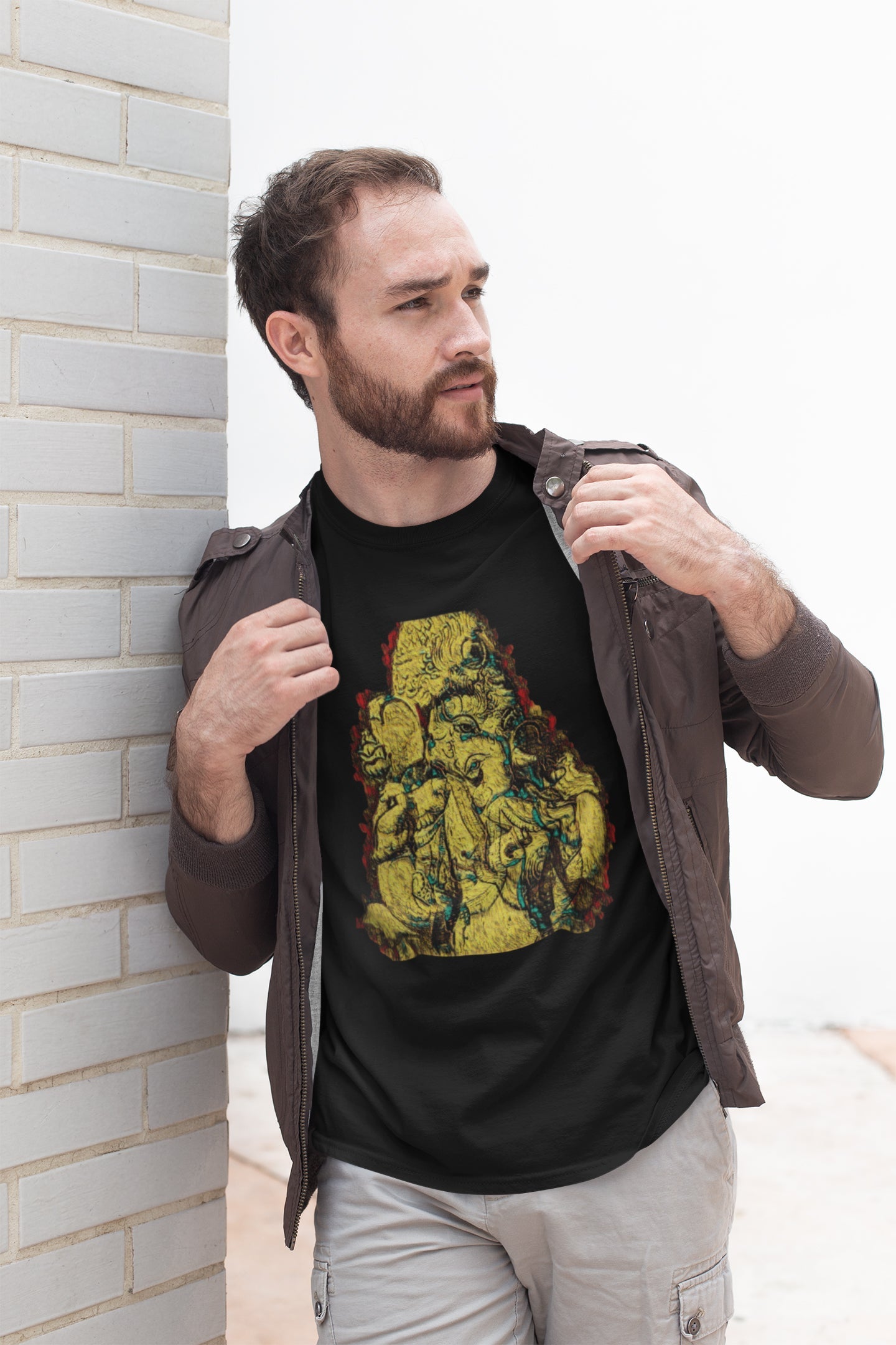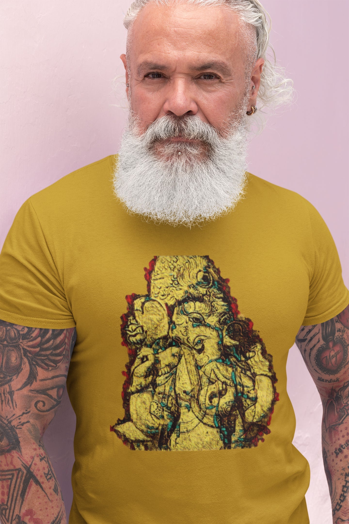 Werten Sie Ihre festliche Kleidung auf und setzen Sie ein starkes Glaubensbekenntnis mit unserem Herren-Sommer-T-Shirt mit dem auffälligen gelben Ganpati-Fresko-Print. Machen Sie sich bereit, das Ganpati-Festival mit Hingabe und Flair zu feiern. Ganpati Bappa Morya! 🙏🌟