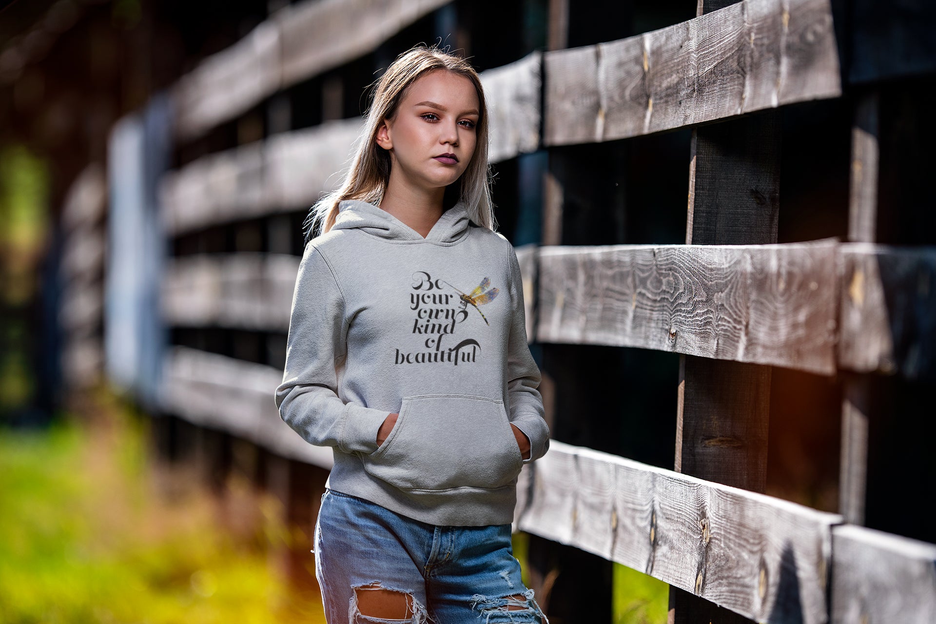 Unsere Hoodies bestehen aus 320 g/m² supergekämmtem, biogewaschenem Stoff mit doppelter Naht und geripptem Derby-Bund.