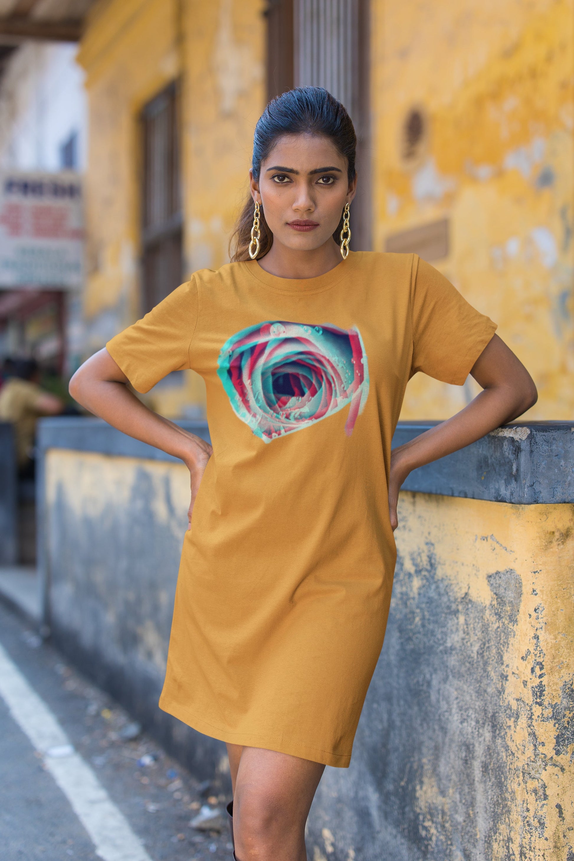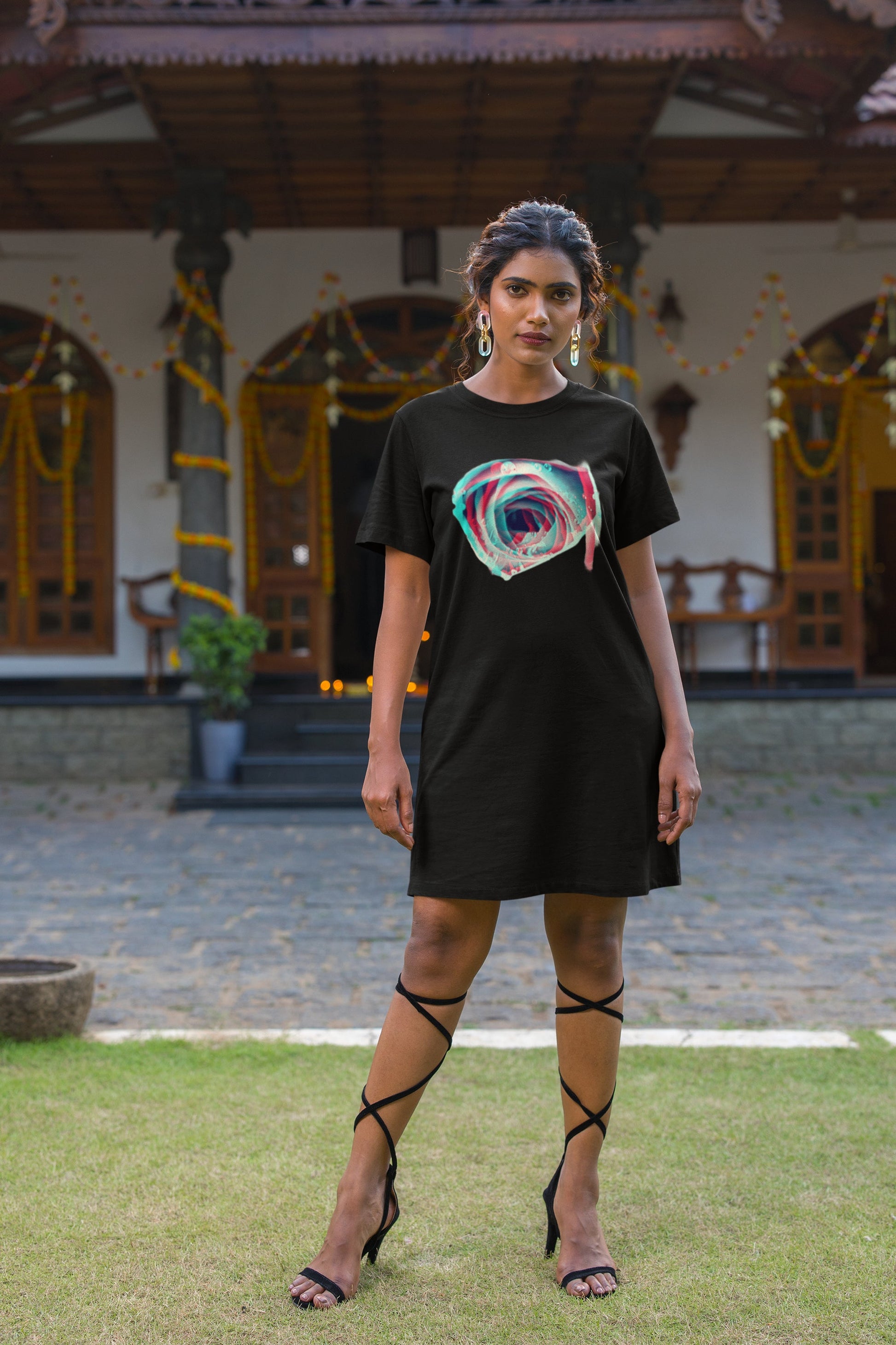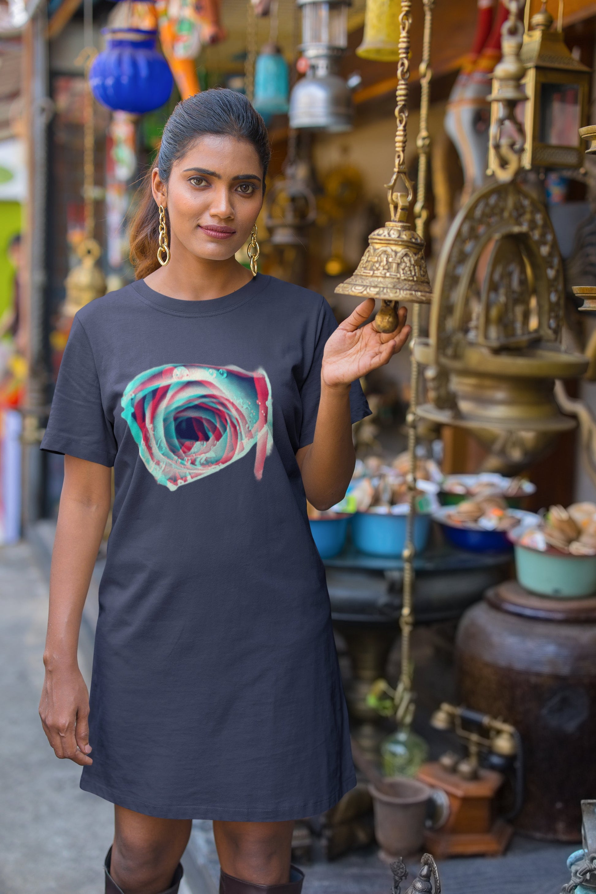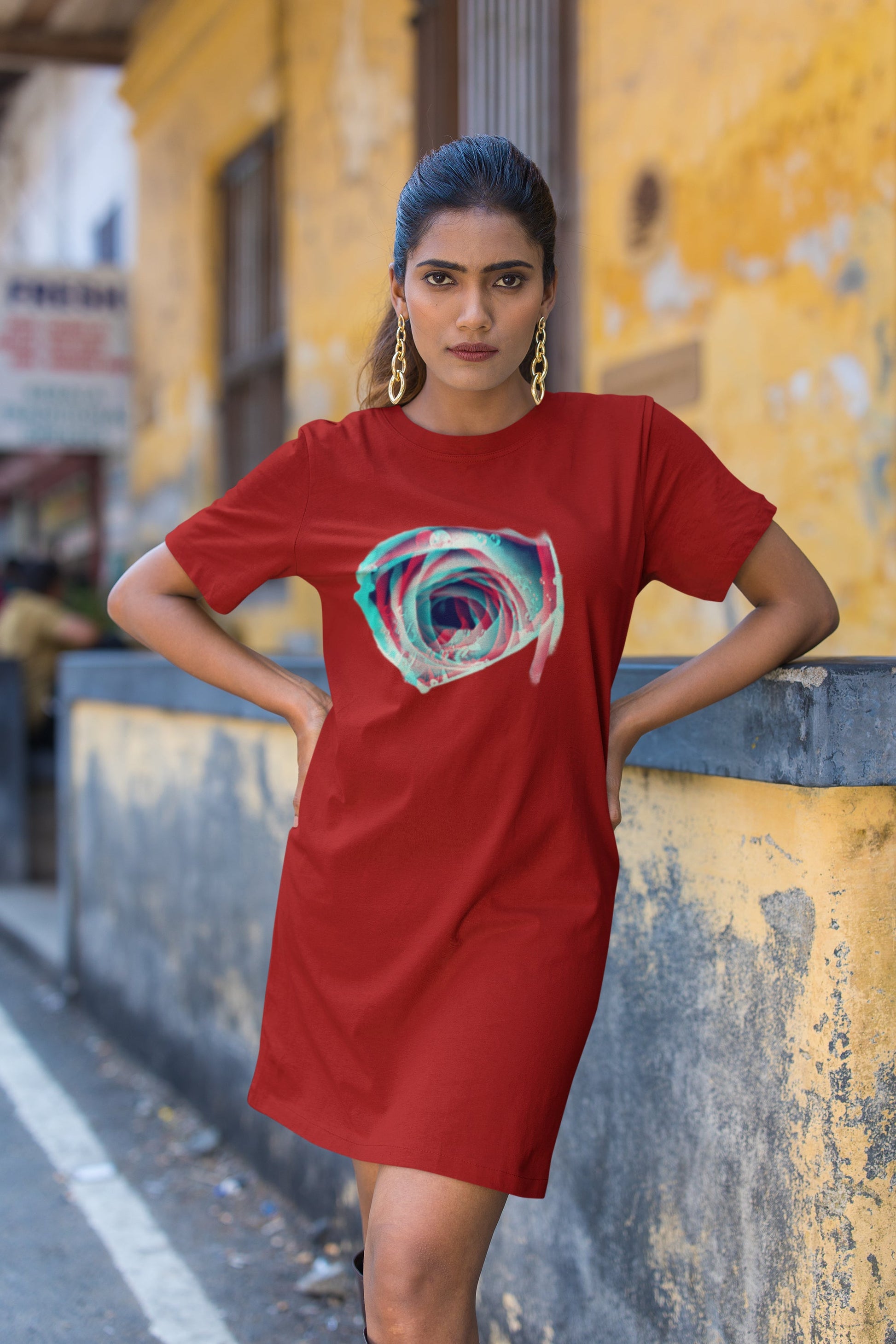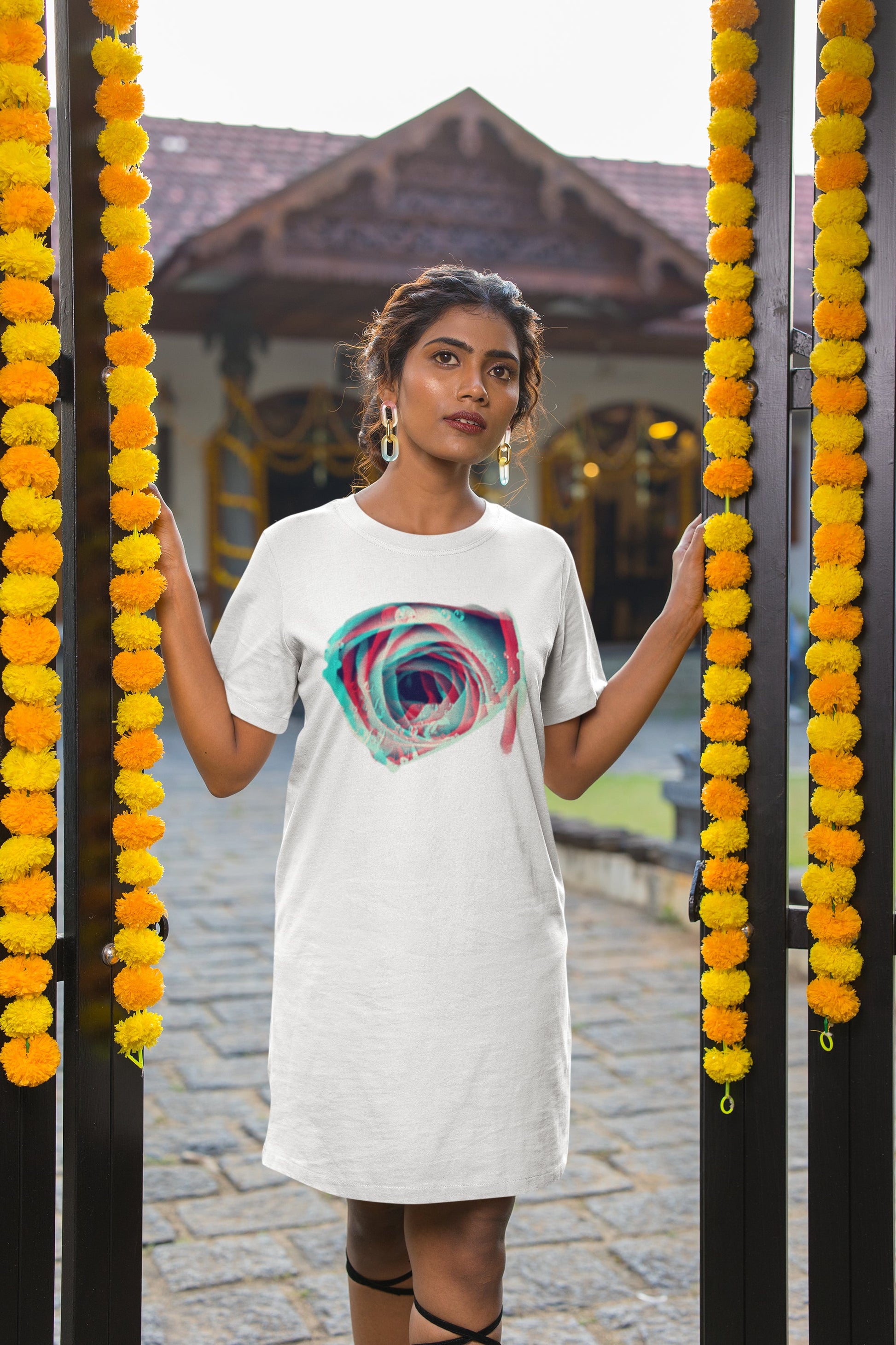Hey there, nature enthusiast! Get ready to embrace the freshness of my garden captured in a T-shirt dress - with the Rose Multicolour T-shirt dress. Picture this: a red rose, post-rainfall, with droplets delicately hanging on like nature's own bling. Yeah, that's the vibe we've got going on here.