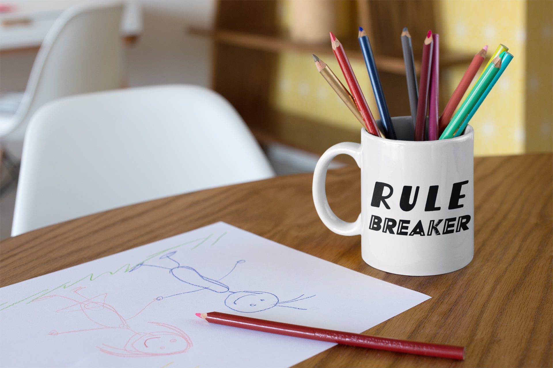 Die Rule Breaker Kaffeetasse wird sicherlich viele Blicke auf sich ziehen. Der Text ist schwarz und hat ein Lineal auf dem Buchstaben K, das Regelverstöße anzeigt.
