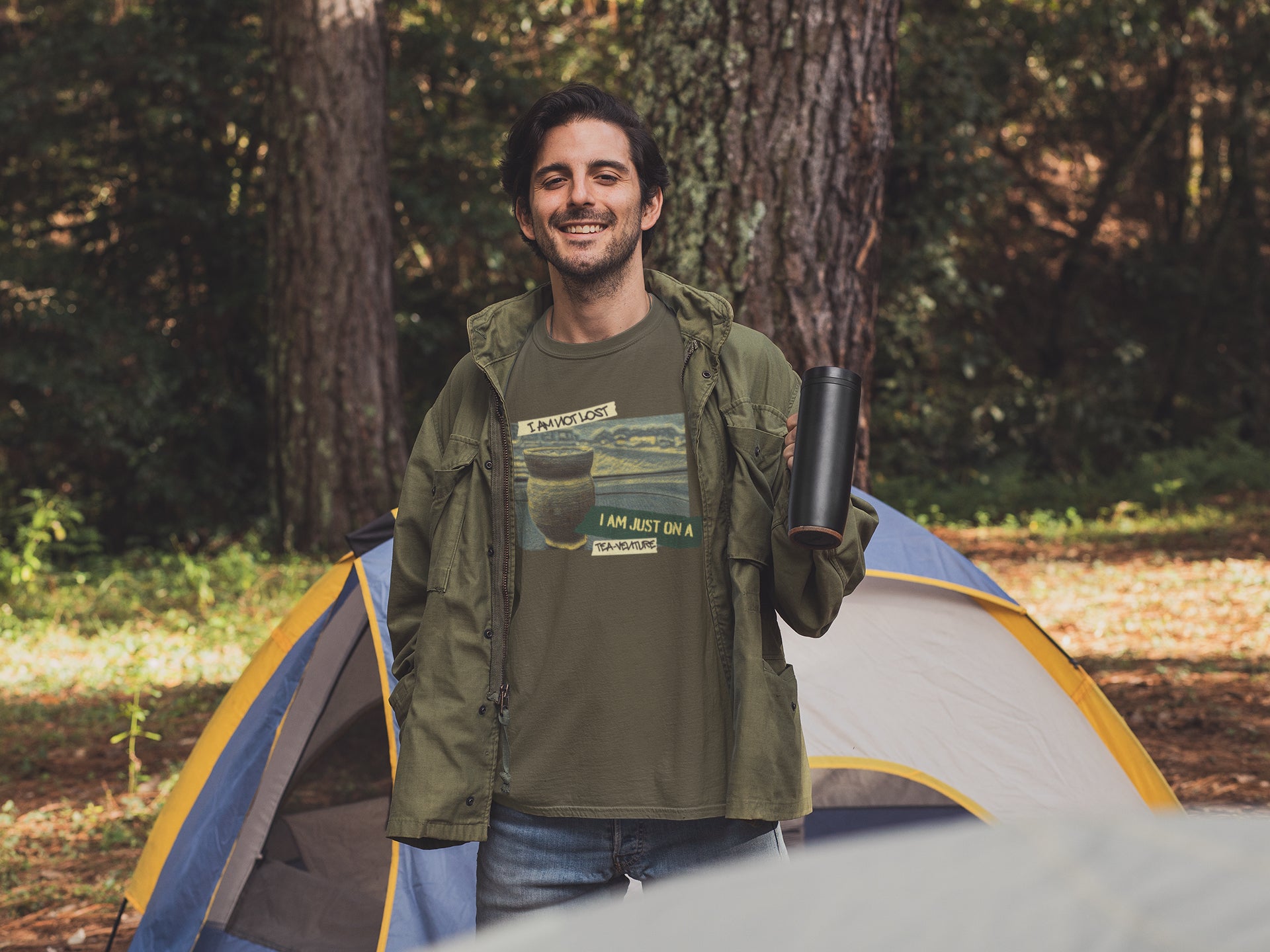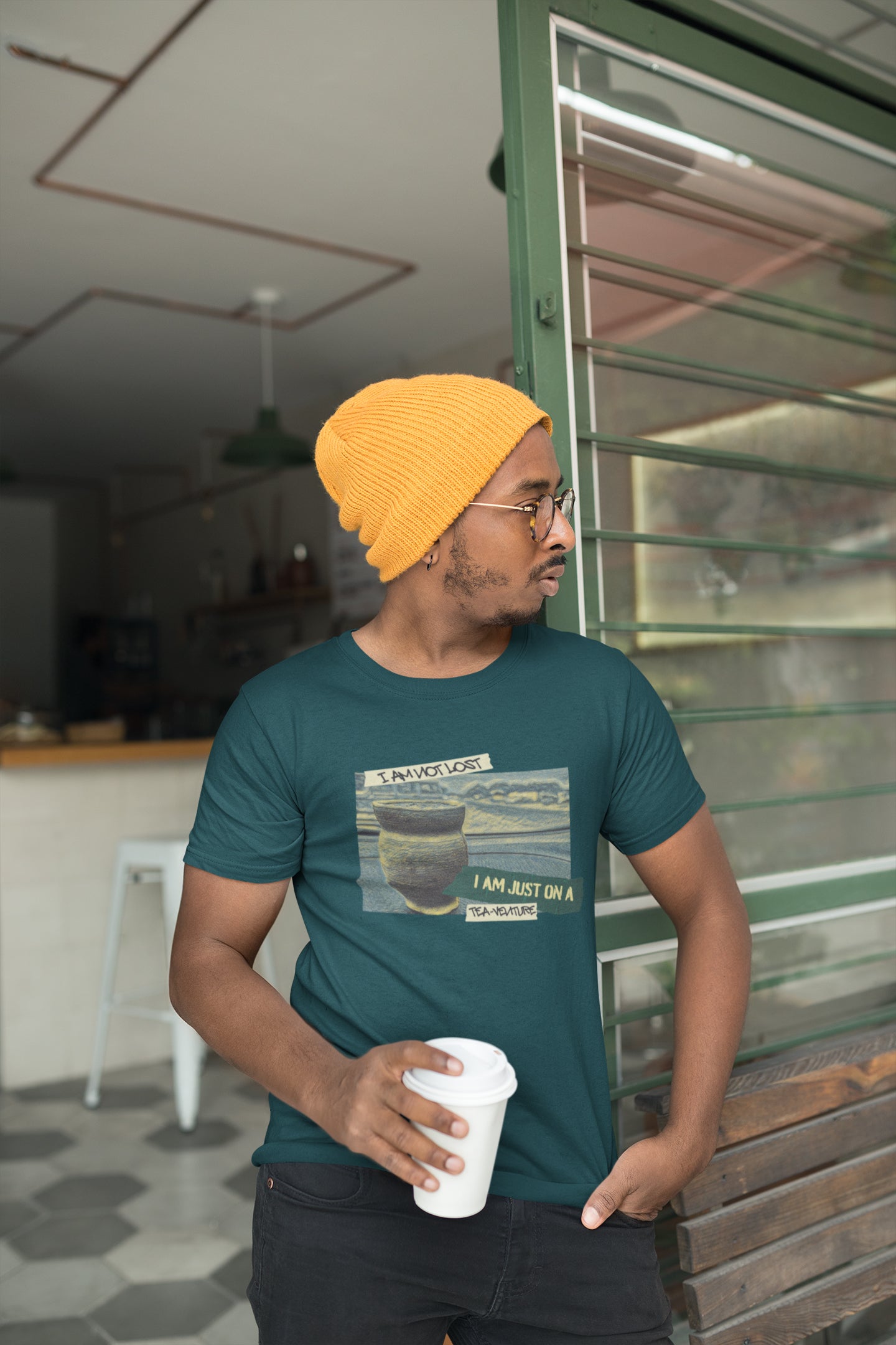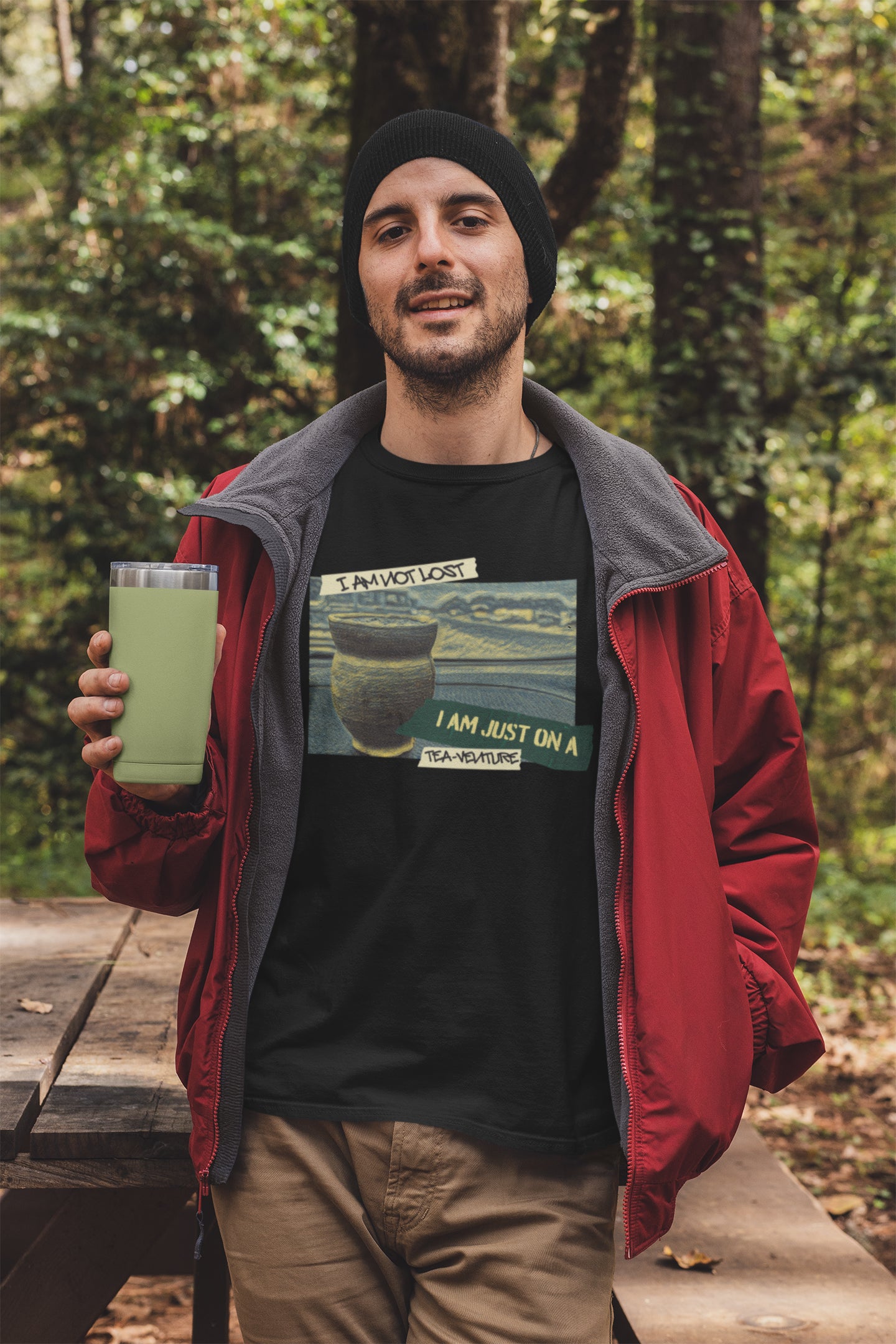 Emblazoned across the image, in bold and adventurous lettering, you'll find the perfect declaration: "I AM NOT LOST" on the top left, and "I AM JUST ON A TEA-VENTURE" on the bottom right. It's a playful nod to the free spirit who knows exactly where they're going, even if the route involves a few delightful tea stops.
