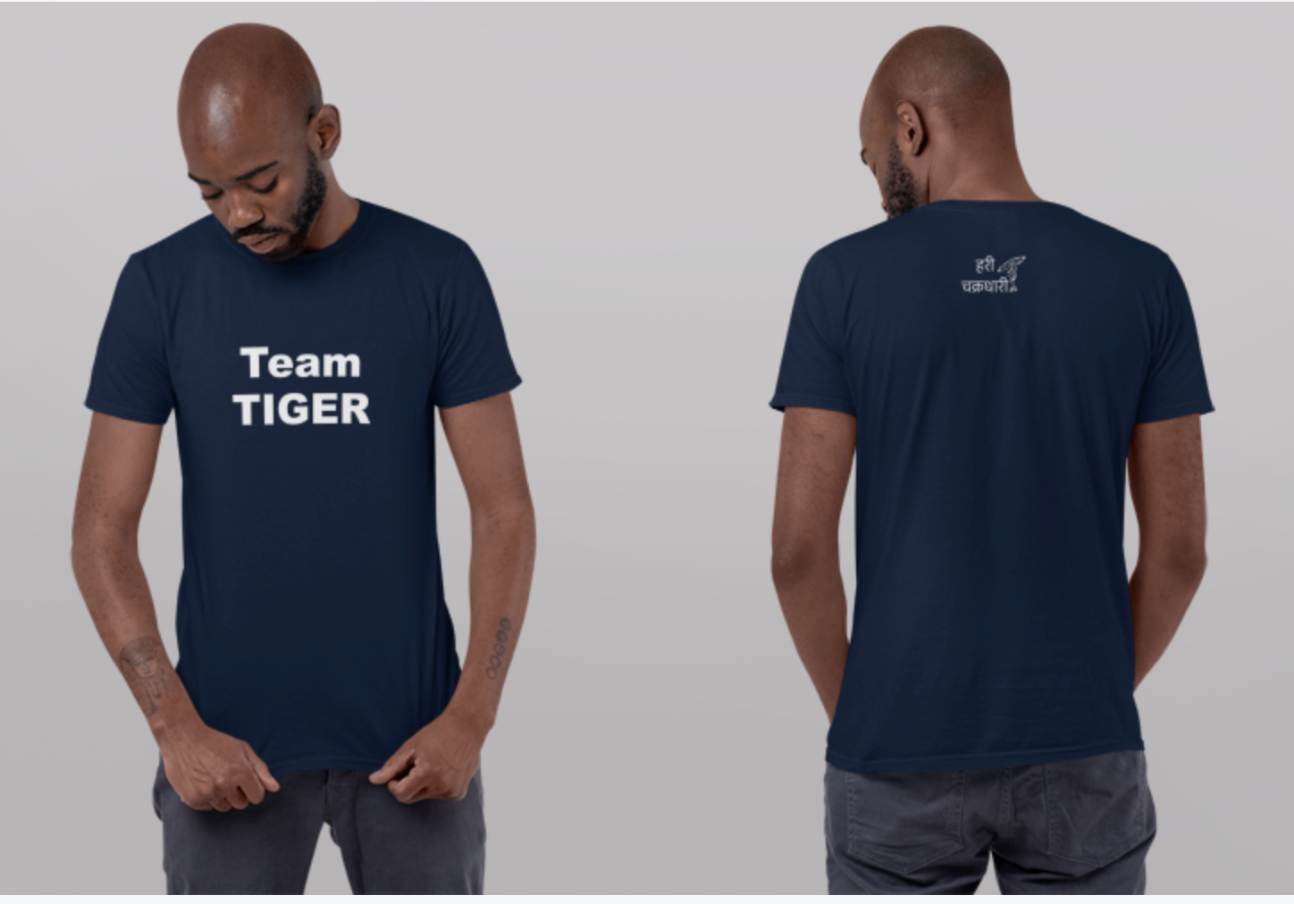 Der Aufdruck „Team Tiger“ mit Namen auf der Rückseite war ein individueller Wunsch von Alan Thomas aus Bangalore. Dies wurde in weißer Farbe für einen Kunden aus Orissa nachgebildet, der ein dunkles T-Shirt wollte.