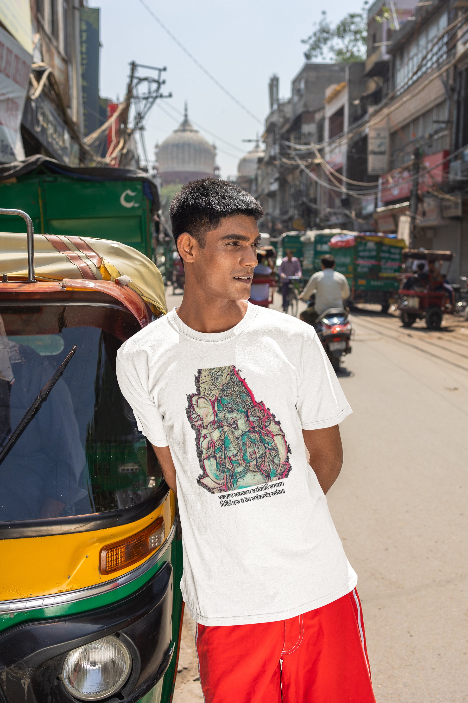 What truly sets this t-shirt apart is the powerful Sanskrit mantra that accompanies the image of Lord Ganesha. Written in the sacred Sanskrit script, it beautifully conveys the essence of devotion and blessings.