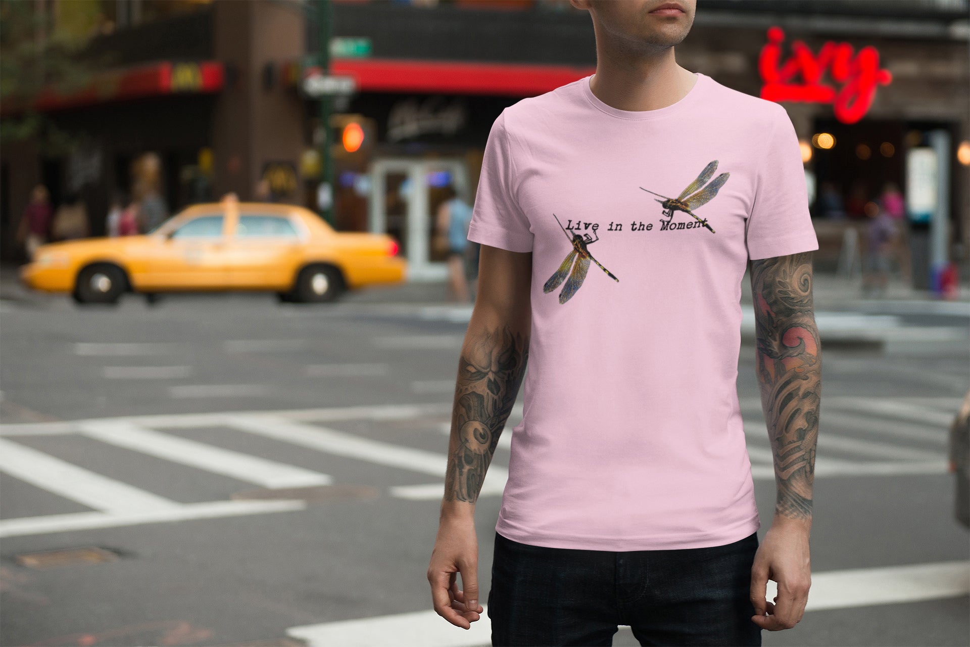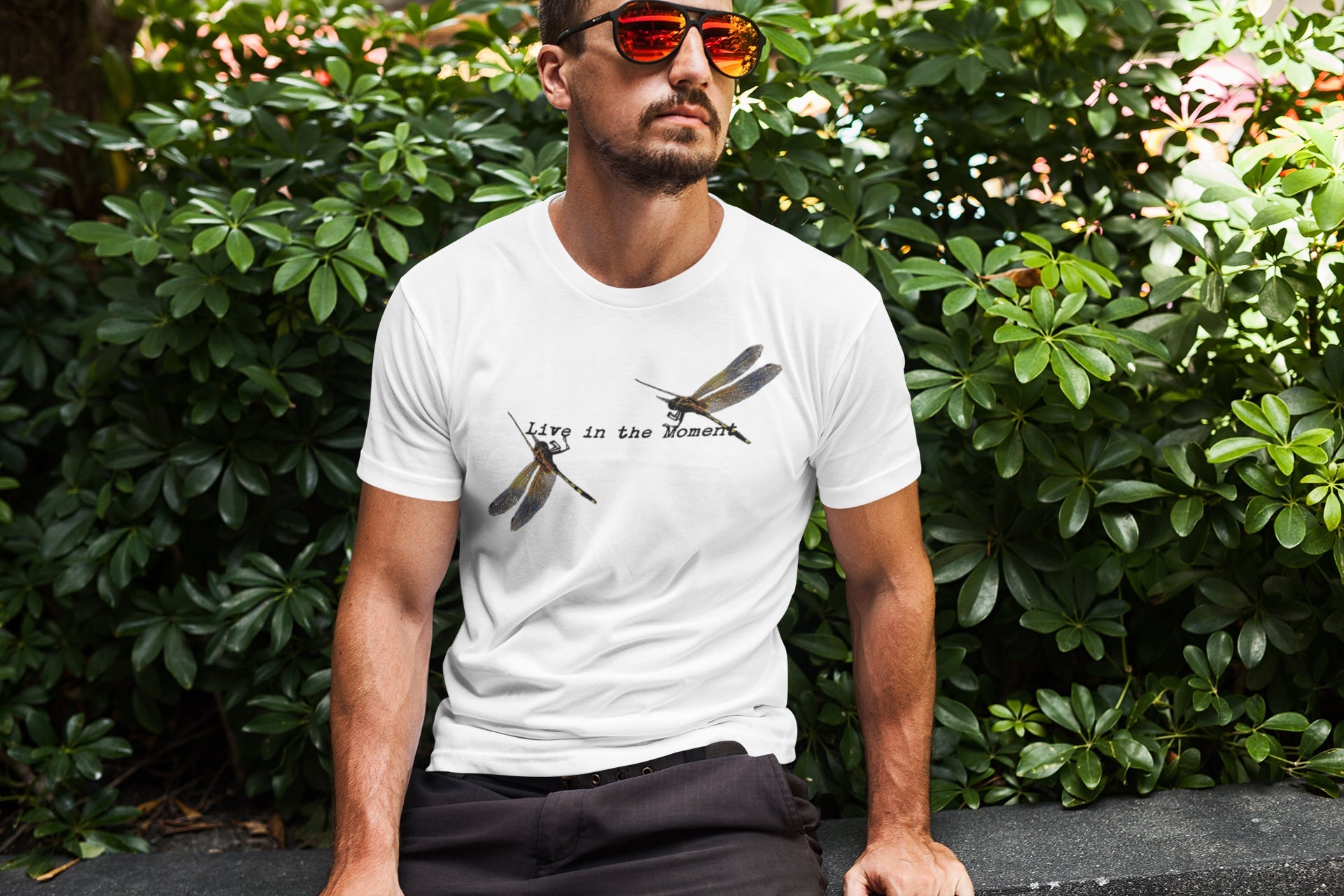 टी-शर्ट में एक प्रेरणादायक और उत्साहवर्धक संदेश है जो आपको वर्तमान में रहने और जीवन के पलों का भरपूर आनंद लेने के लिए प्रोत्साहित करता है। शर्ट के सामने की तरफ आकर्षक फ़ॉन्ट में "लिव इन द मोमेंट" शब्द प्रमुखता से प्रदर्शित किए गए हैं, साथ ही पाठ के कोनों पर दो ड्रैगनफ़्लाई भी हैं।
