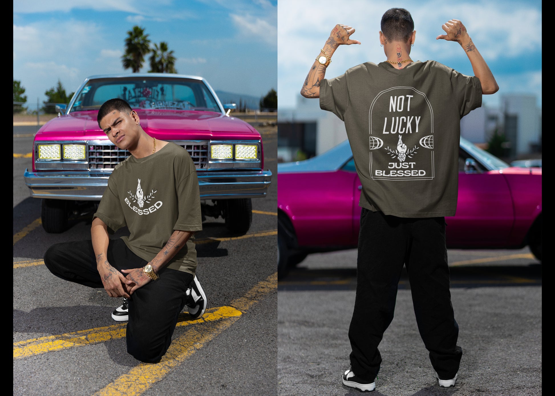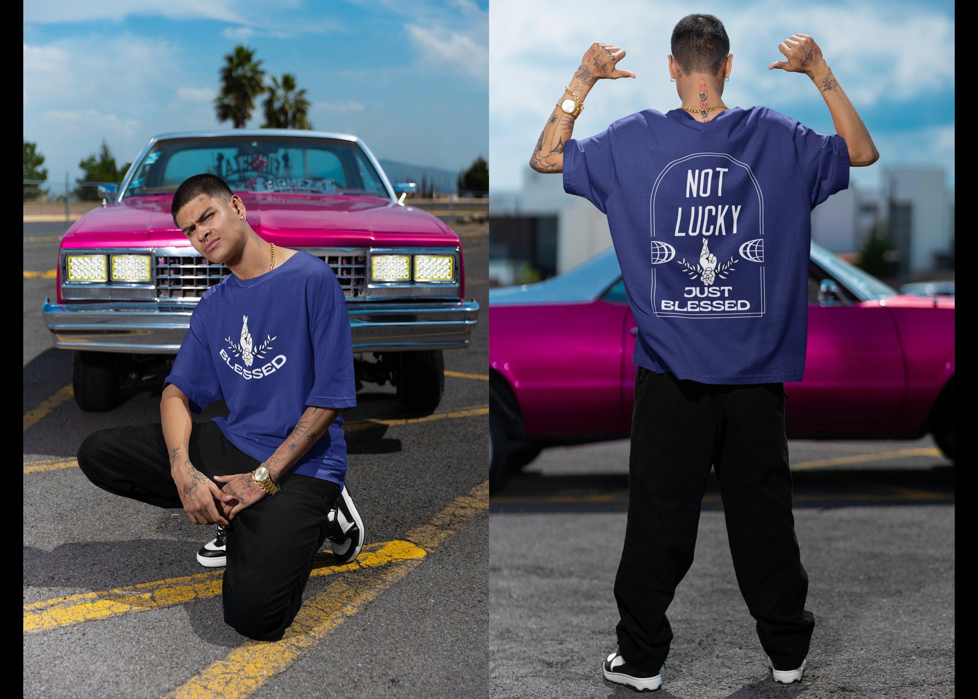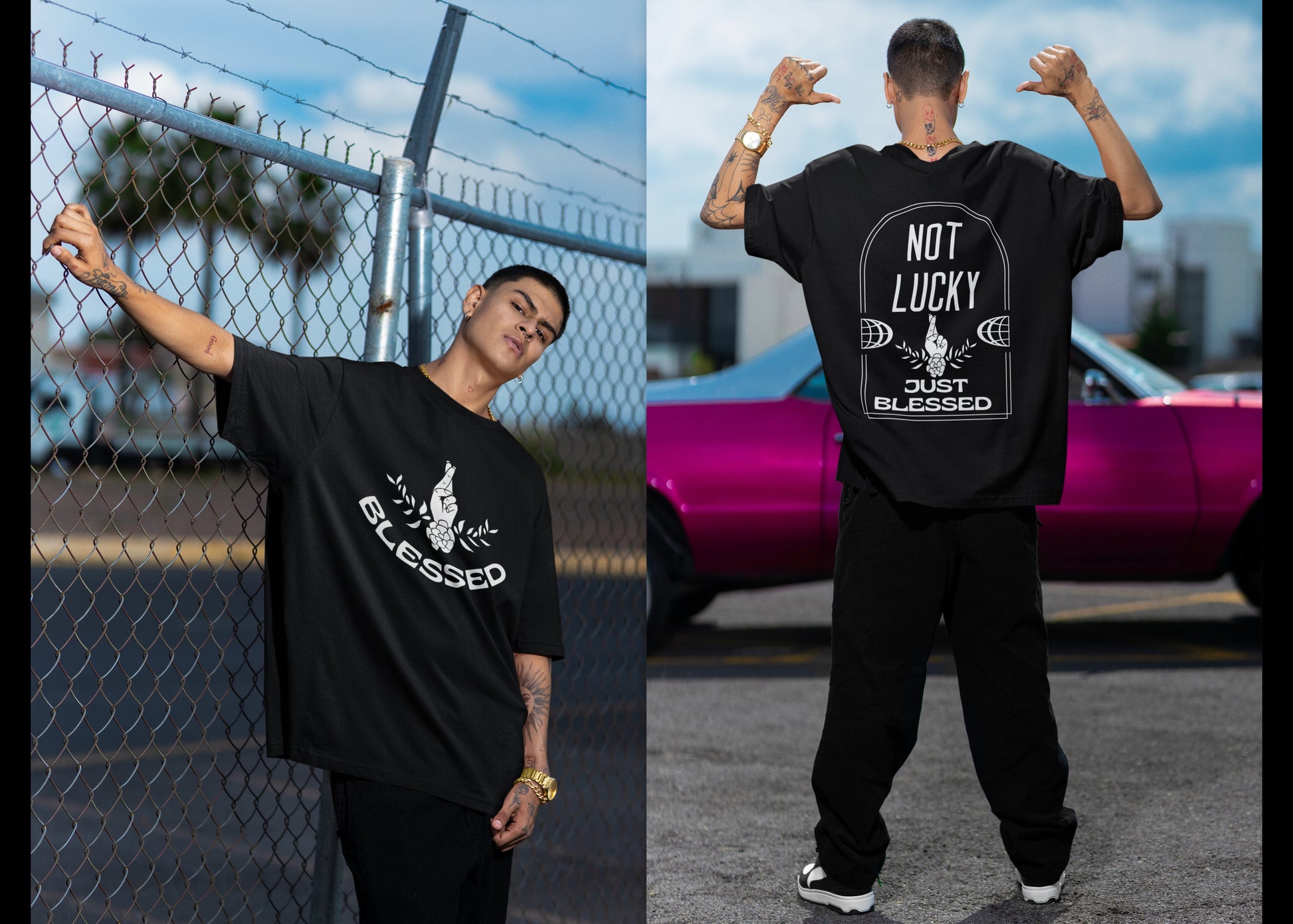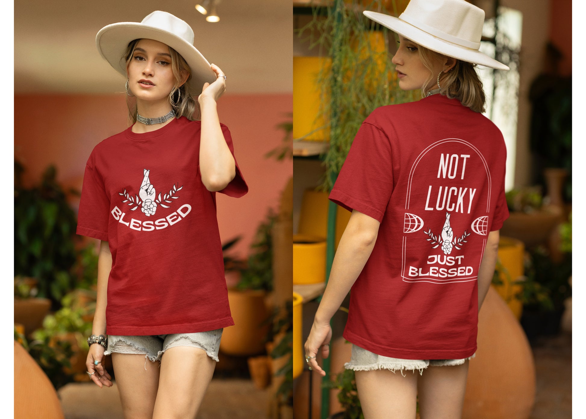 - सामने और पीछे के प्रिंट: सामने की तरफ़ "धन्य" संदेश केंद्र में है, जिसे एक चंचल क्रॉस फिंगर ग्राफ़िक के साथ जोड़ा गया है। पीछे की तरफ़, पूरा कथन "भाग्यशाली नहीं, बस धन्य" एक और क्रॉस फिंगर के साथ उभरा हुआ है, जो एक शानदार धनुषाकार बॉर्डर में घिरा हुआ है।