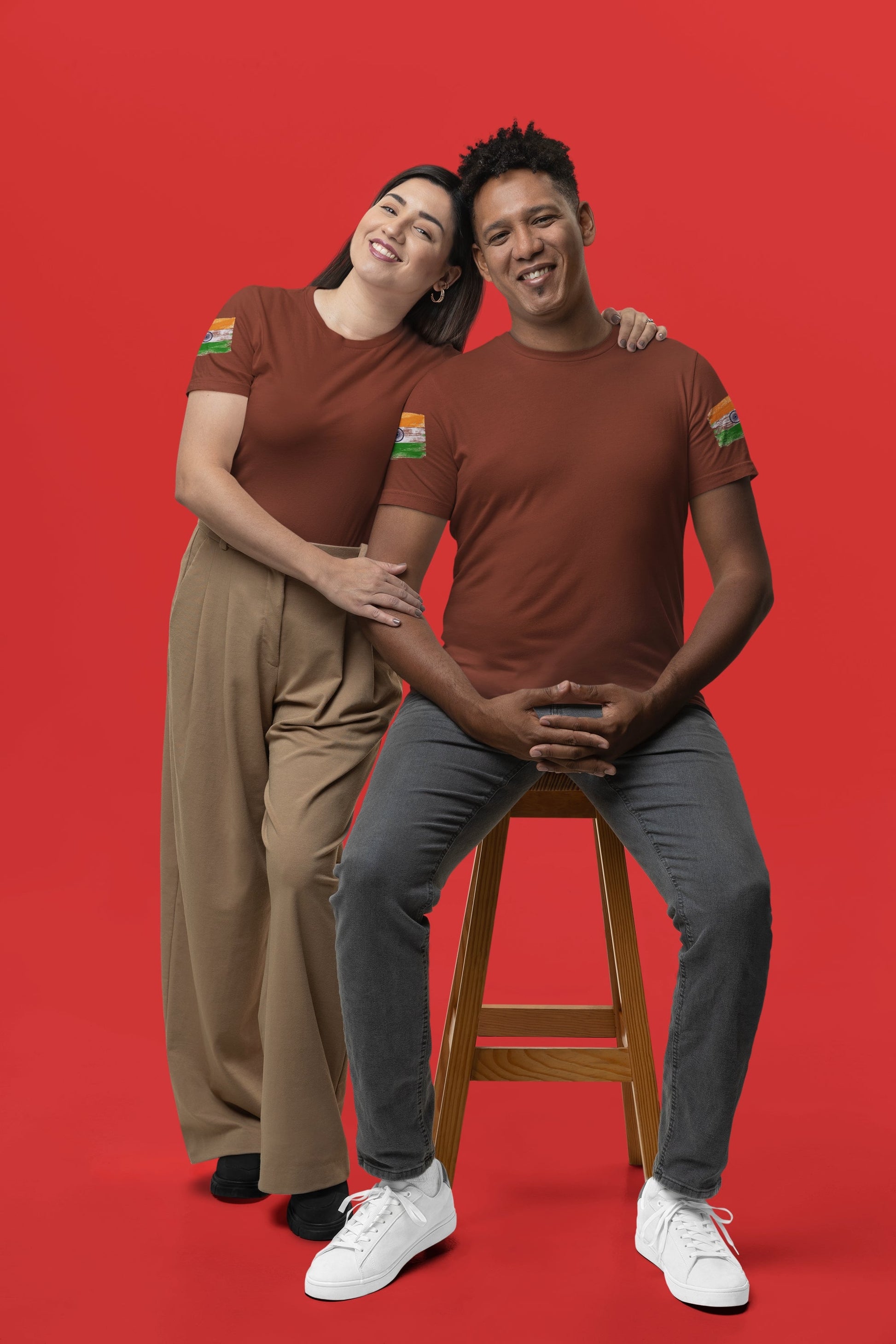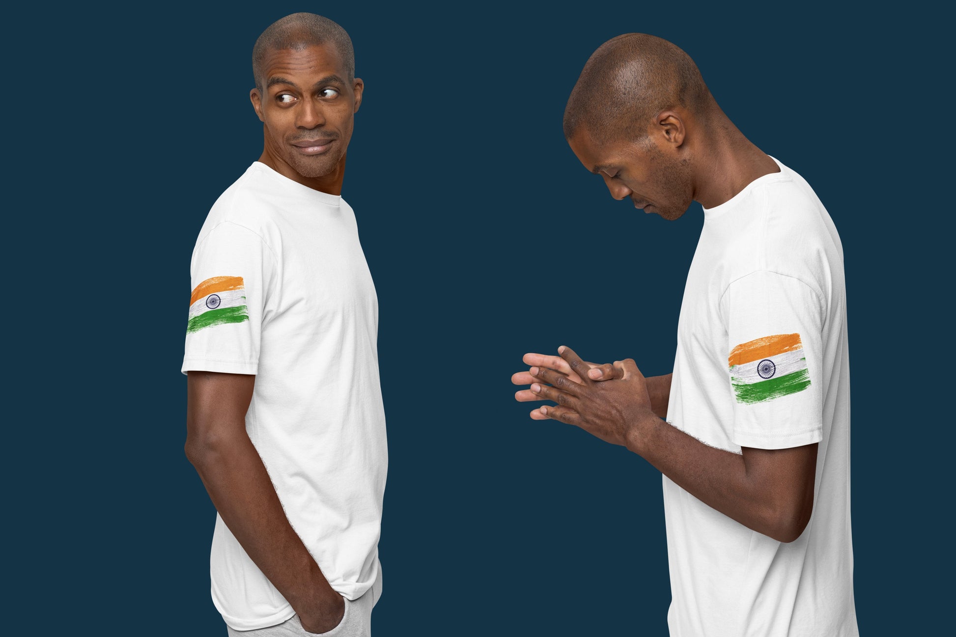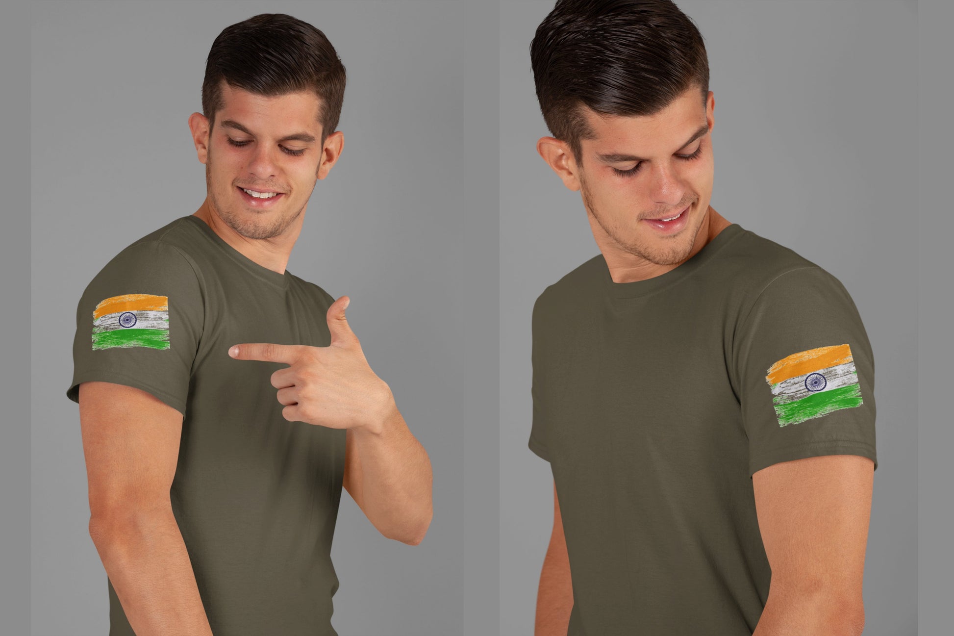 Elevate your patriotism with our Flag Sleeve Print T-shirt for Men. Embrace the essence of India in a minimalistic and tasteful way.